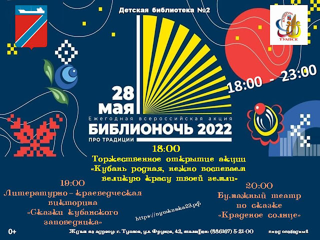 #БИБЛИОНОЧЬ_ 2022#КультураРФ#PROтрадиции#Карусельнародныхсказок#культураКубани#читающийТуапсе Навигация по записям Библионочь 2022 Библиотека-филиал №3 Библионочь 2022 Детская библиотека им. А. П. Гайдара (Ф5)