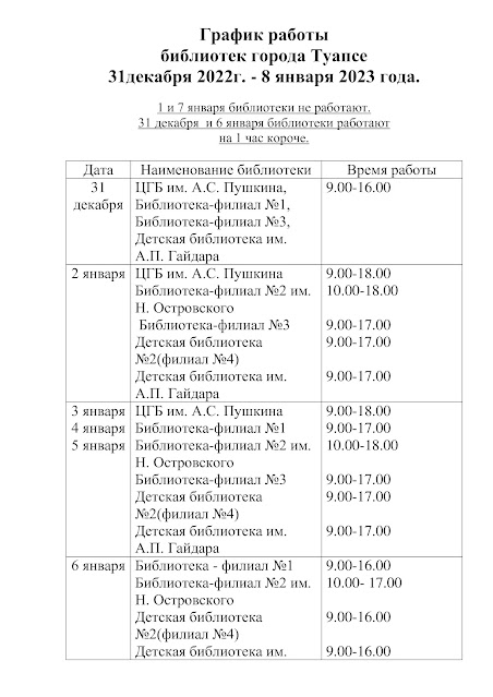 График работы библиотек города Туапсе 31декабря 2022г. – 8 января 2023 года