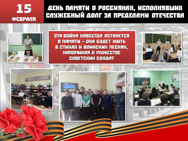 В библиотеках города Туапсе прошли мероприятия, посвященные Дню памяти о россиянах, исполнявших служебный долг за пределами Отечества: обзор книжной выставки «Выполняя долг интернациональный…», литературно-исторический набат «Афганистан: без права на забвение», час патриотизма «Из пламени афганской войны…», устный журнал «Во имя Родины и долга» и др.