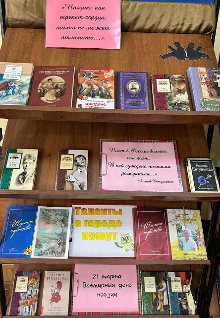 Ежегодно 21 марта во всём мире отмечается День поэзии. Поэзия — это одно из самых гениальных достижений человечества! Изливать свои чувства в стихотворной форме, мечтать о будущем и вспоминать прошлое, одновременно обращаясь к миллионам и оставаясь при этом наедине с собой, — на это способна только поэзия. В библиотеках города Туапсе в этот день звучали бессмертные стихи Александра Пушкина, Сергея Есенина, Марины Цветаевой и других отечественных поэтов, работали книжные выставки и тематические просмотры, проведены литературные композиции, творческие игры-сочинялки и другие мероприятия, основной темой которых стал чарующий мир поэзии.