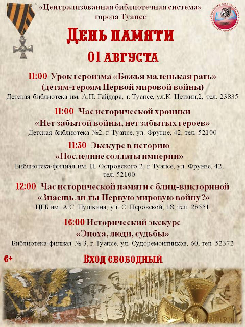 1 августа в России отмечается День памяти российских воинов, погибших в Первой мировой войне 1914-1918 годов. Библиотеки города Туапсе приглашает своих читателей и гостей посетить тематические мероприятия и прикоснуться к героическим и трагическим страницам нашей истории.