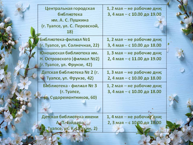 30.04.2025 автор: pushkinka Уважаемые читатели! Сердечно поздравляем вас с наступающими майскими праздниками! Мира, тепла, семейного благополучия, процветания!Обращаем ваше внимание на график работы библиотек в выходные праздничные дни.